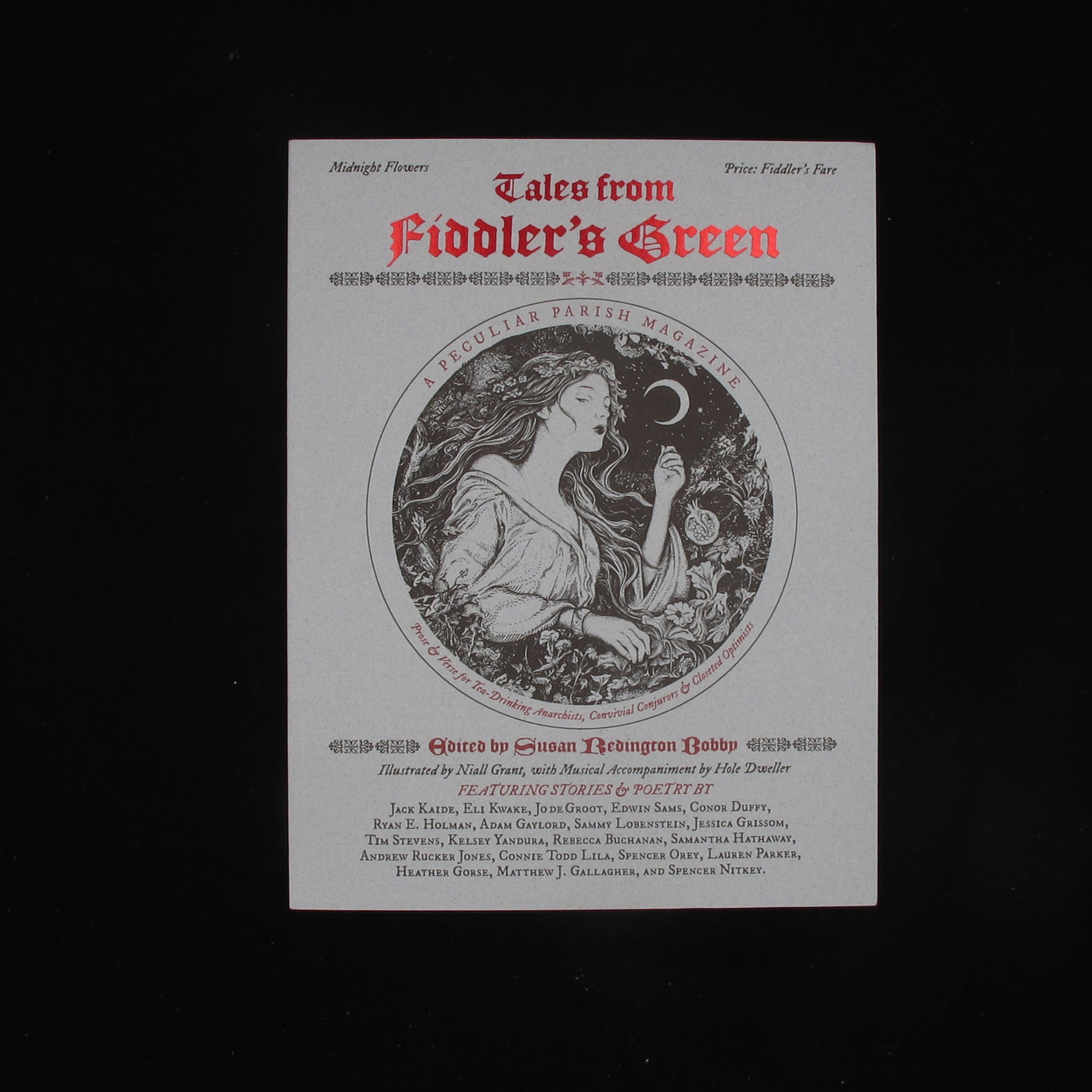 Tales from Fiddler’s Green 2 features red foil titling, illustrations throughout by Niall Grant, and 80 pages of short fiction and poetry, including the following: